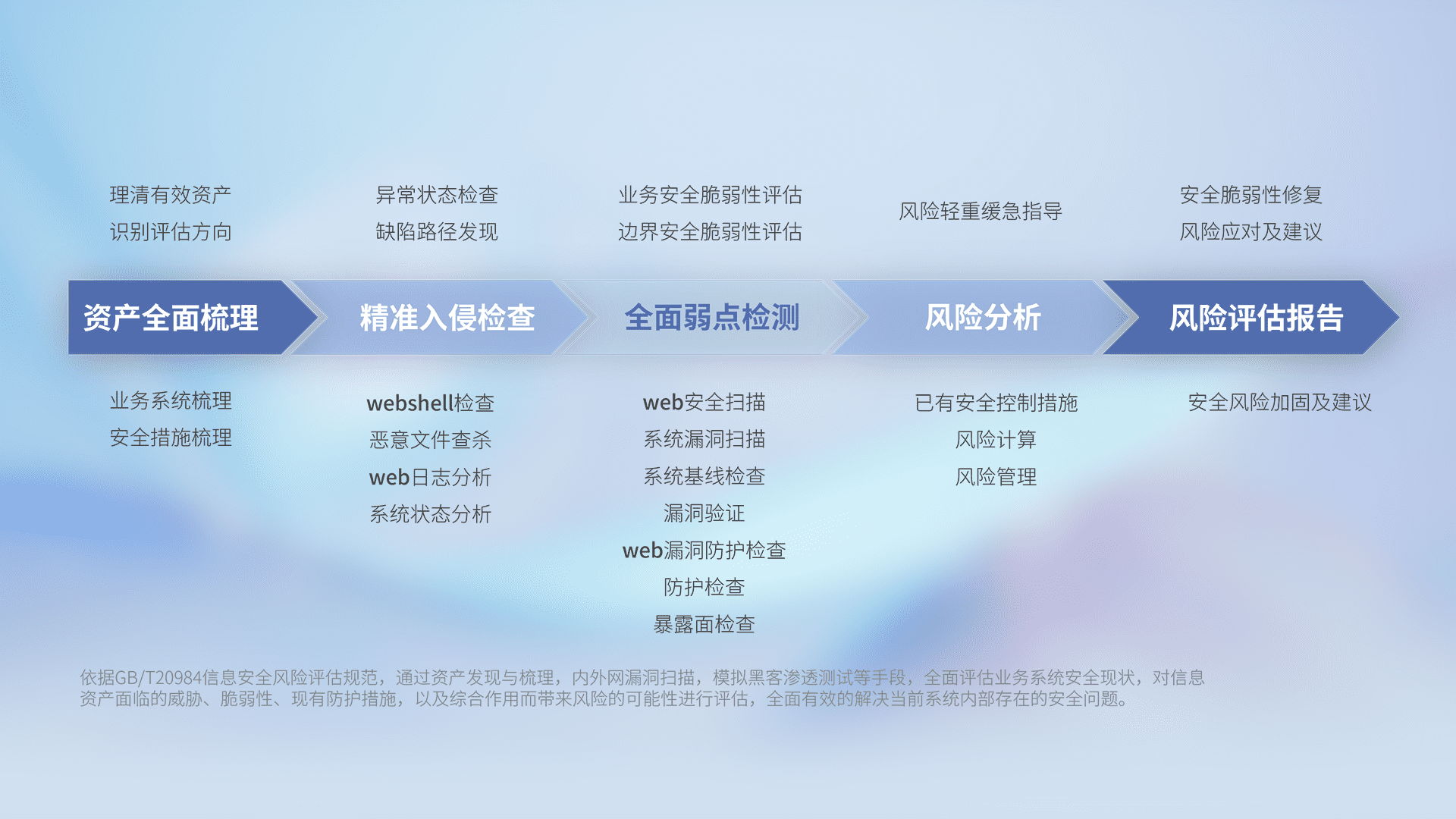 针对客户行业特性,,以专业的安全服务+多厂商联合解决方案提供专属的一站式安全管理服务,,帮助客户全面感知网络空间威胁,,,基于识别、、、、检测、、、、分析、、、、防护、、、、监测、、、、响应的服务理论模型,,,从方案咨询、、集成交付、、评估验证、、、优化加固、、、、运维运营,,,,致力于为客户提供完整的闭环管理式安全服务。。。以实战经验为客户打造高抵御风险的安全体系,,,帮助客户发现威胁、、、、对抗威胁、、、处置威胁,,不断积累安全对抗能力,,持续保障数字化安全。。。。